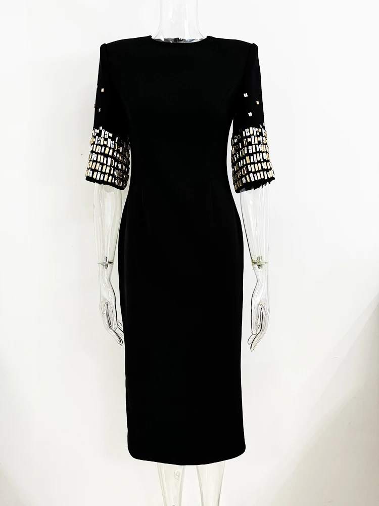 أحدث صيحات الموضة لعام 2024 من HIGH STREET فستان نسائي رسمي نصف كم من حجر الراين والألماس مطرز ميدي