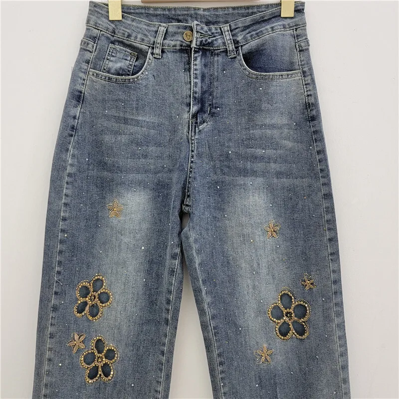جينز نسائي عالي الخصر مستقيم على شكل زهور مفرغة من حجر الراين