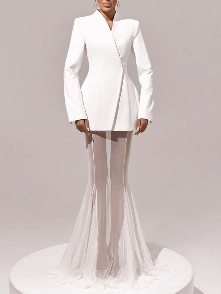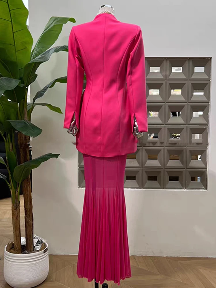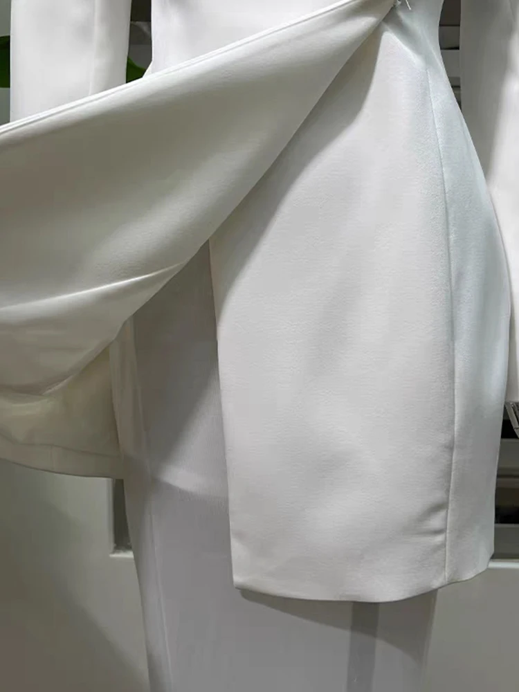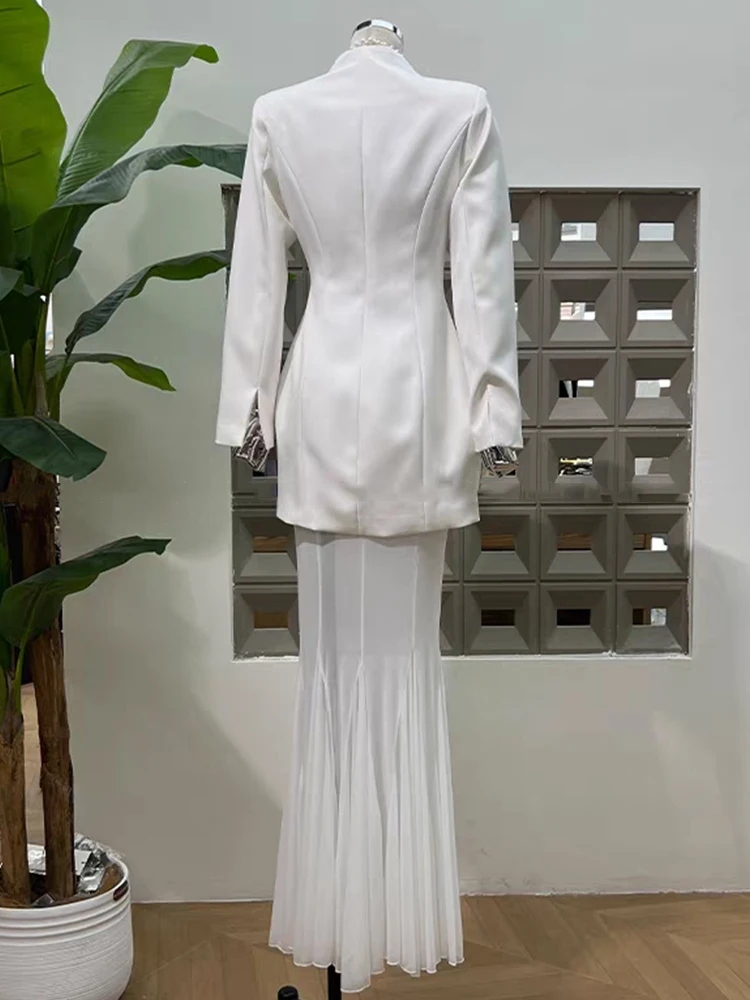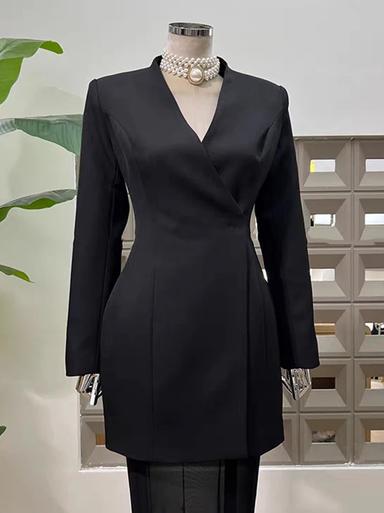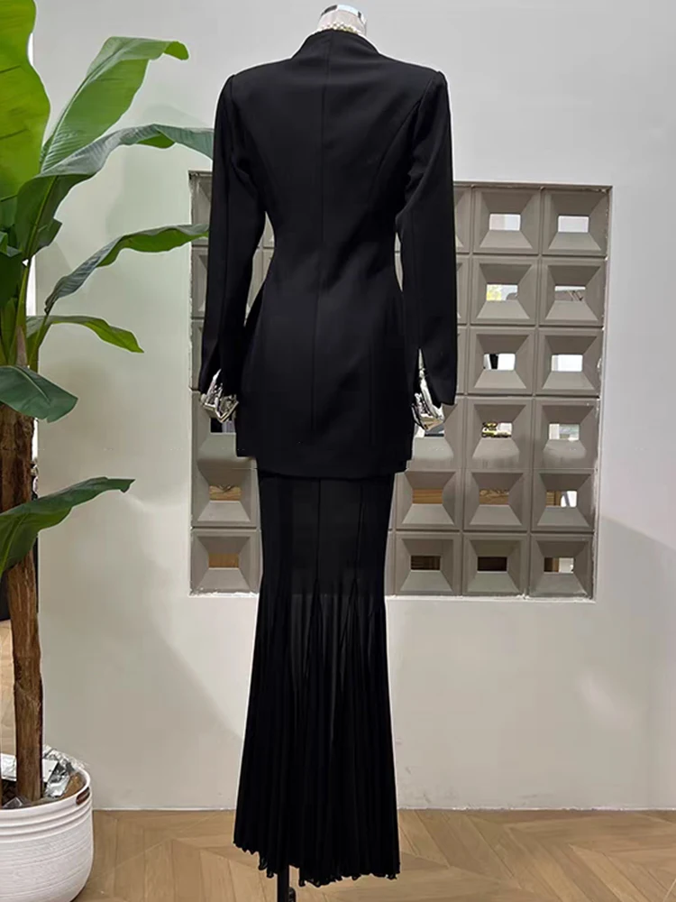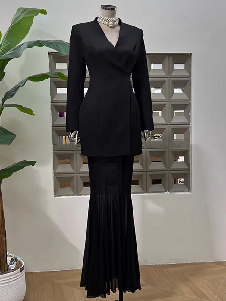 طقم بدلة متوسطة الطول بخصر على شكل حرف V لخريف 2025 ملابس نسائية + طقم تنورة ذيل السمكة + شورت