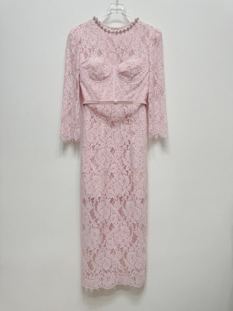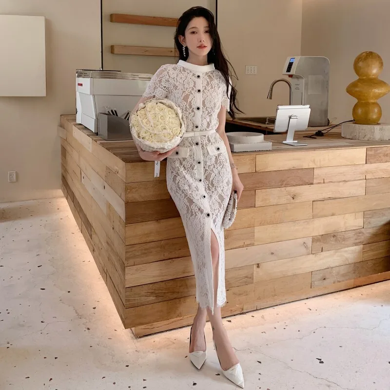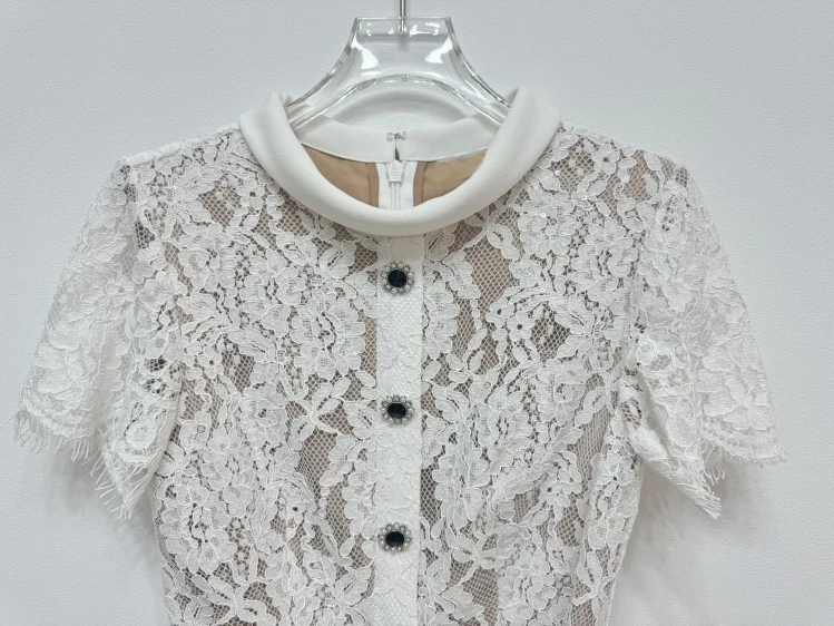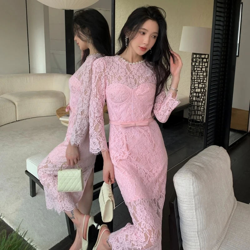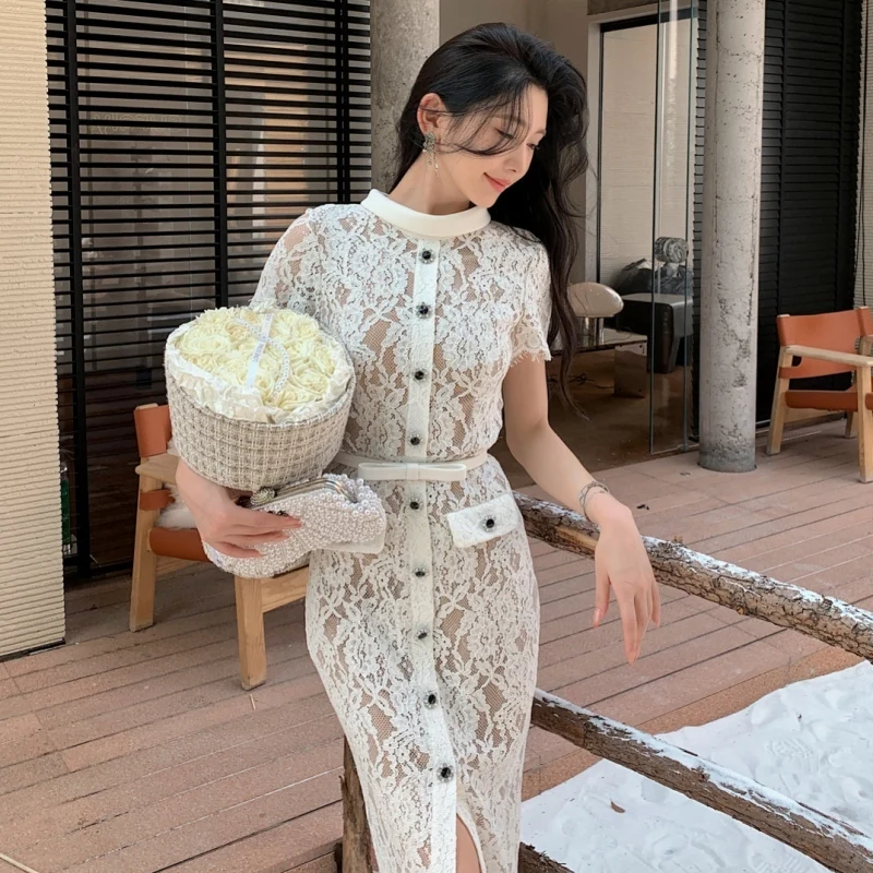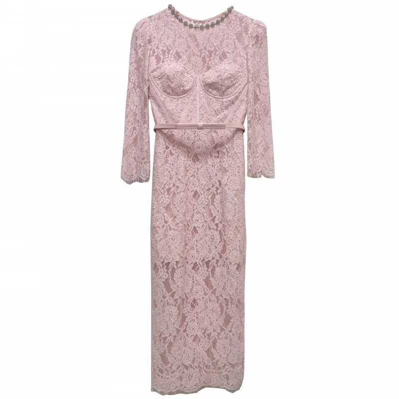 فاخر 2025 الصيف حبة كريستال مثير منظور رمش الدانتيل فستان طويل المرأة مساء قصيرة الأكمام قلم رصاص فساتين متوسطة الطول