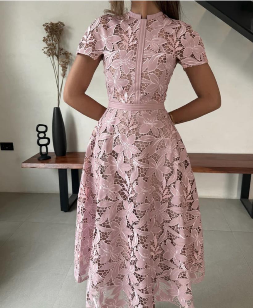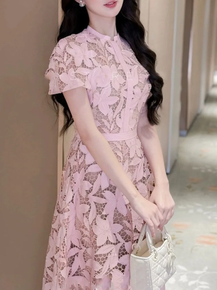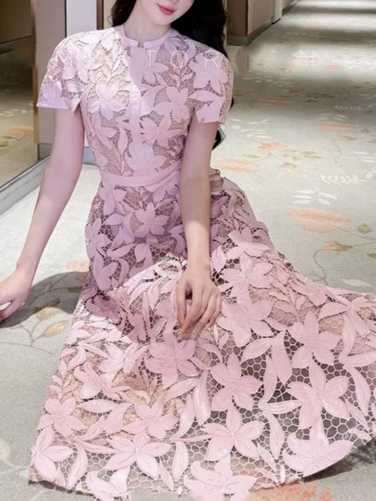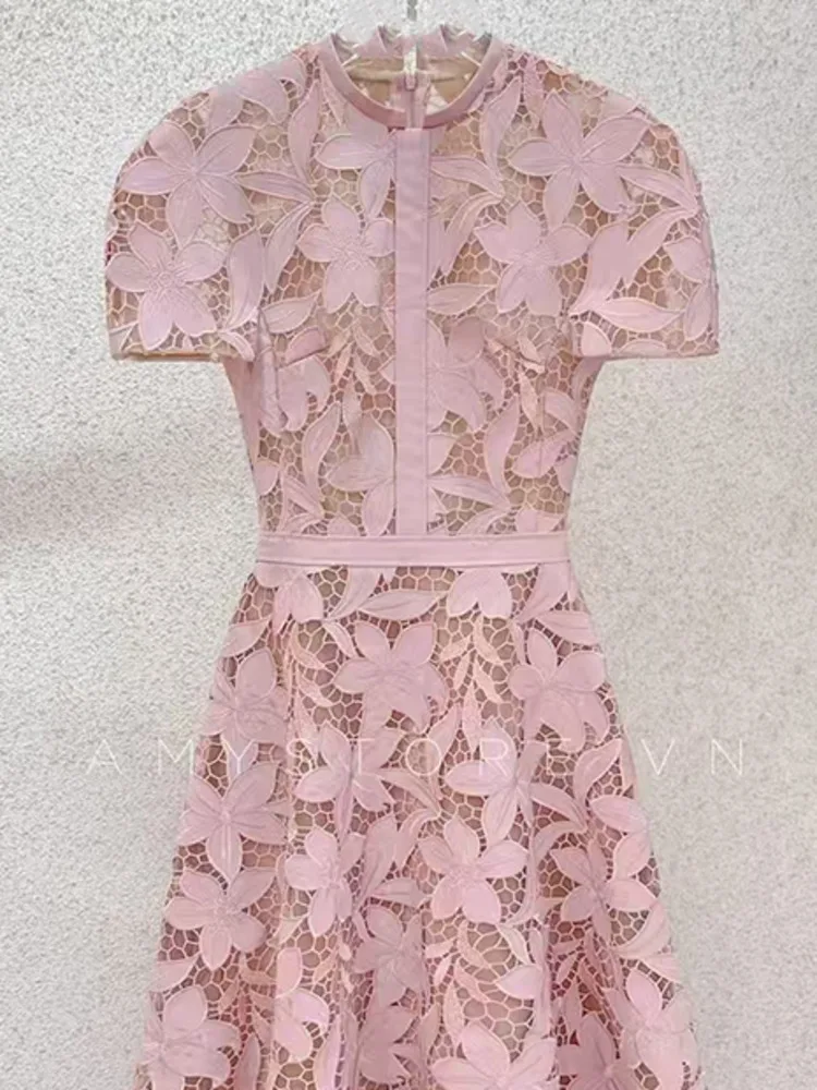 فستان أنيق برقبة دائرية مطرز بالزهور تفريغ الدانتيل على شكل حرف a