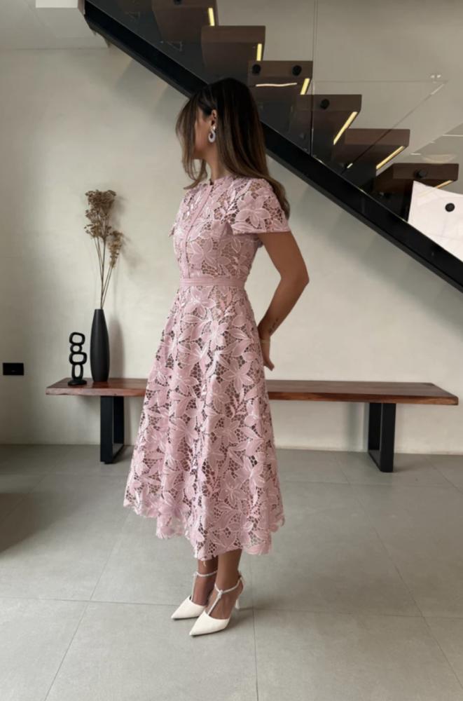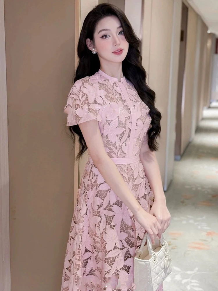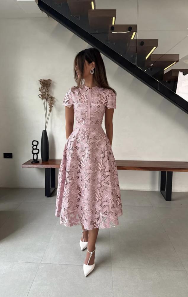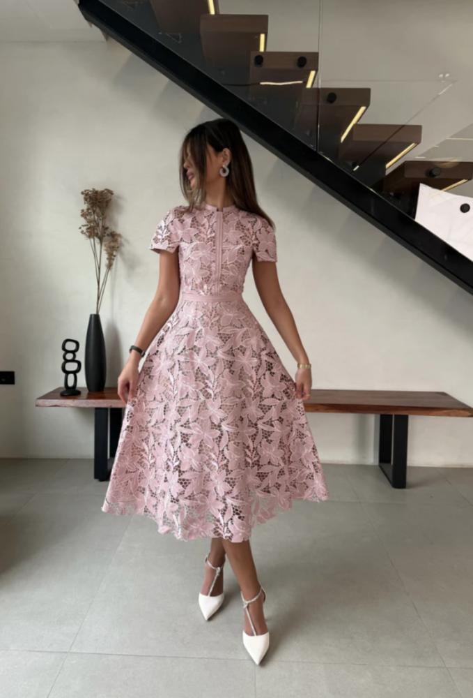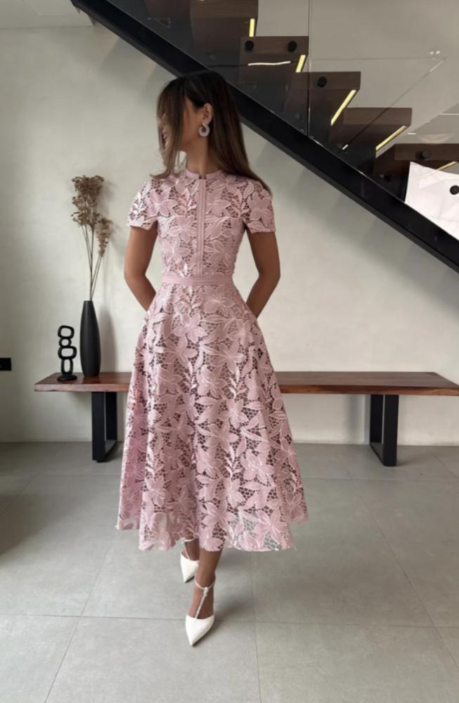فستان أنيق برقبة دائرية مطرز بالزهور تفريغ الدانتيل على شكل حرف a