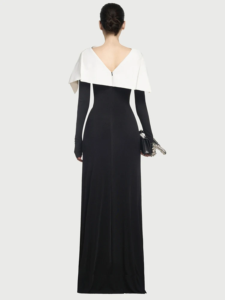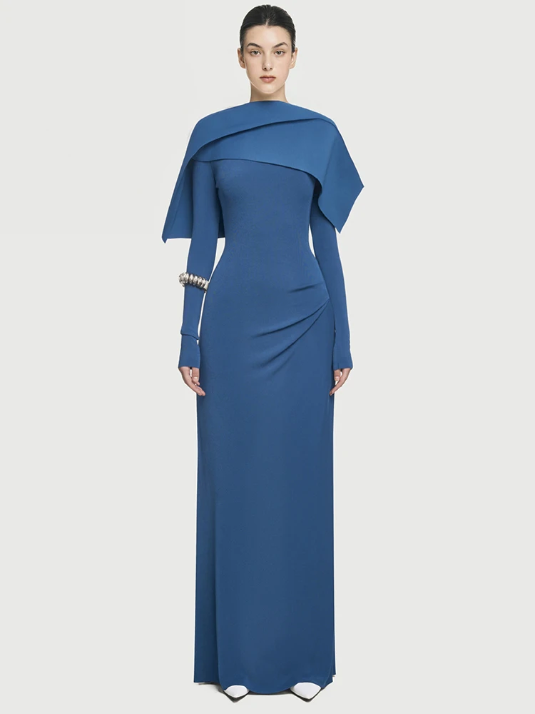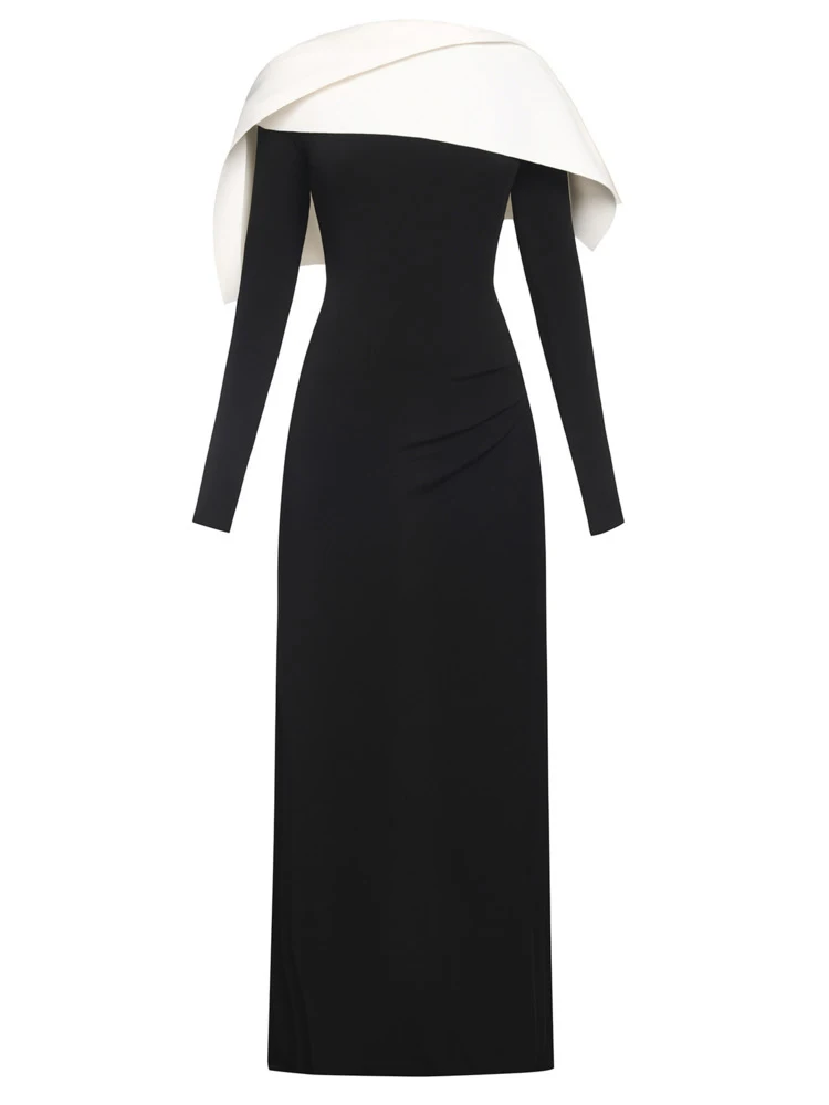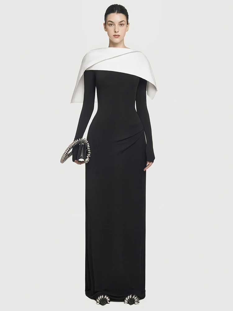 فستان أنيق مطوي غير متماثل كيب كم طويل ألوان متباينة