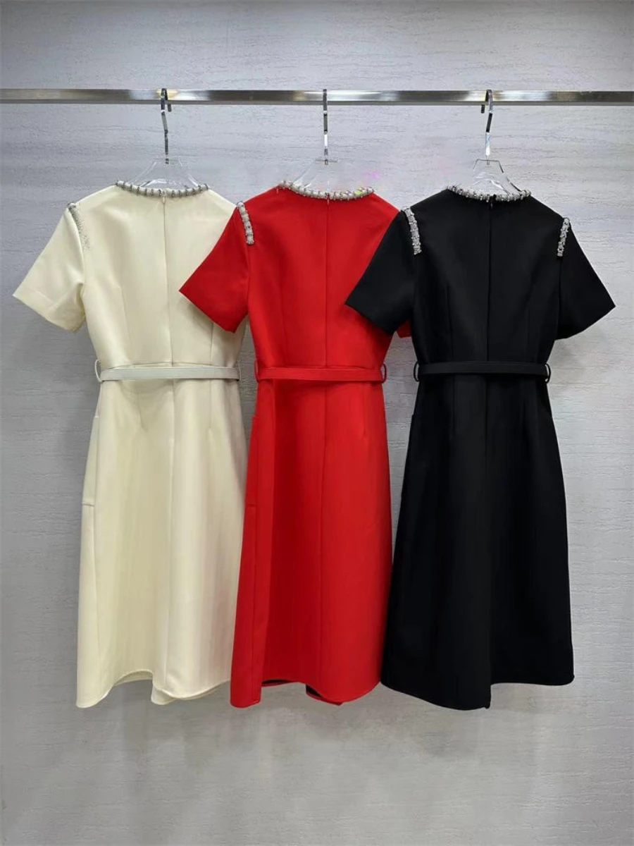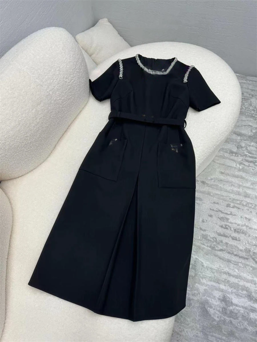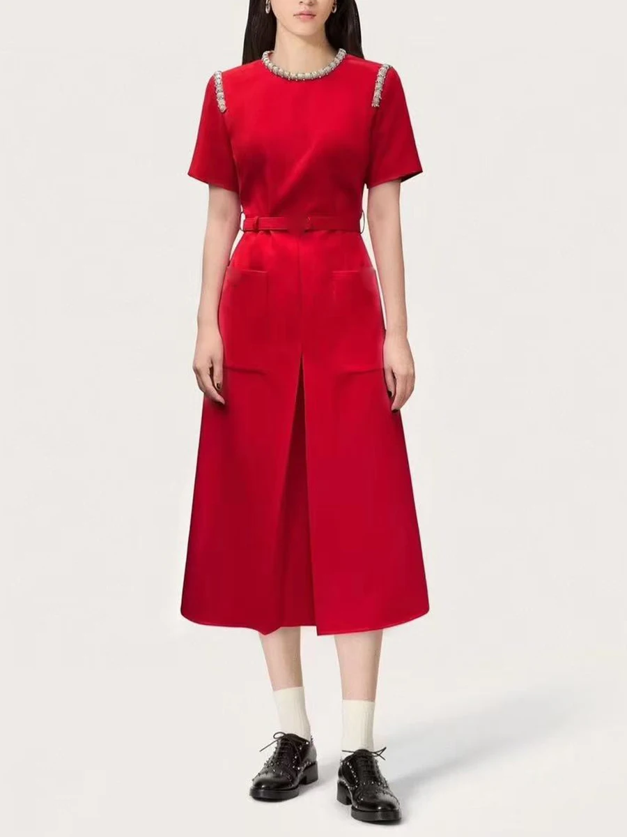 فستان بتصميم ميدي بمزاج متين مع حزام للنساء بياقة دائرية وأكمام قصيرة وخصر عالي وجيوب مقسمة فساتين نسائية