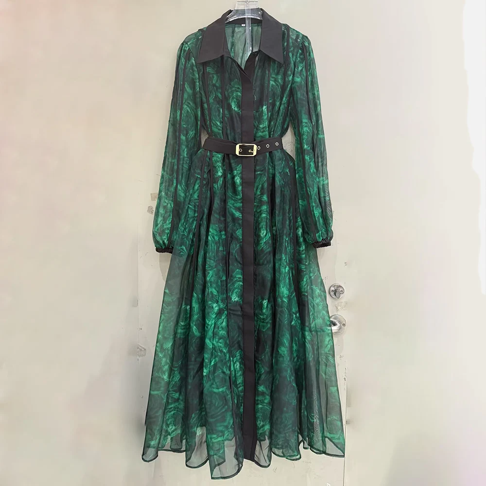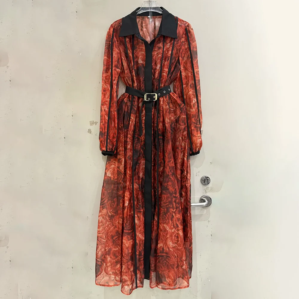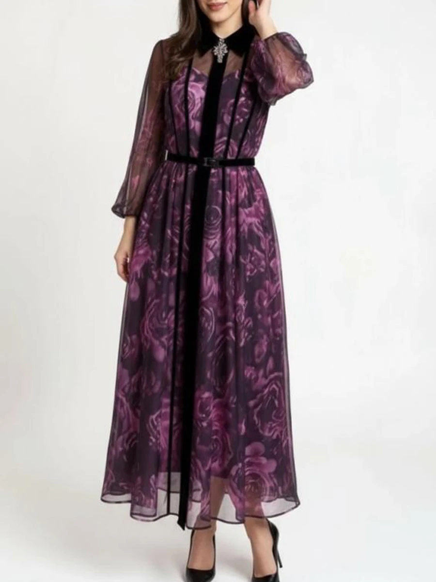 فستان بطباعة الأزهار للنساء ذو طية صدر السترة وأكمام واسعة وخصر عالي ومرقعة بقماش شفاف فساتين طويلة نسائية عصرية جديدة