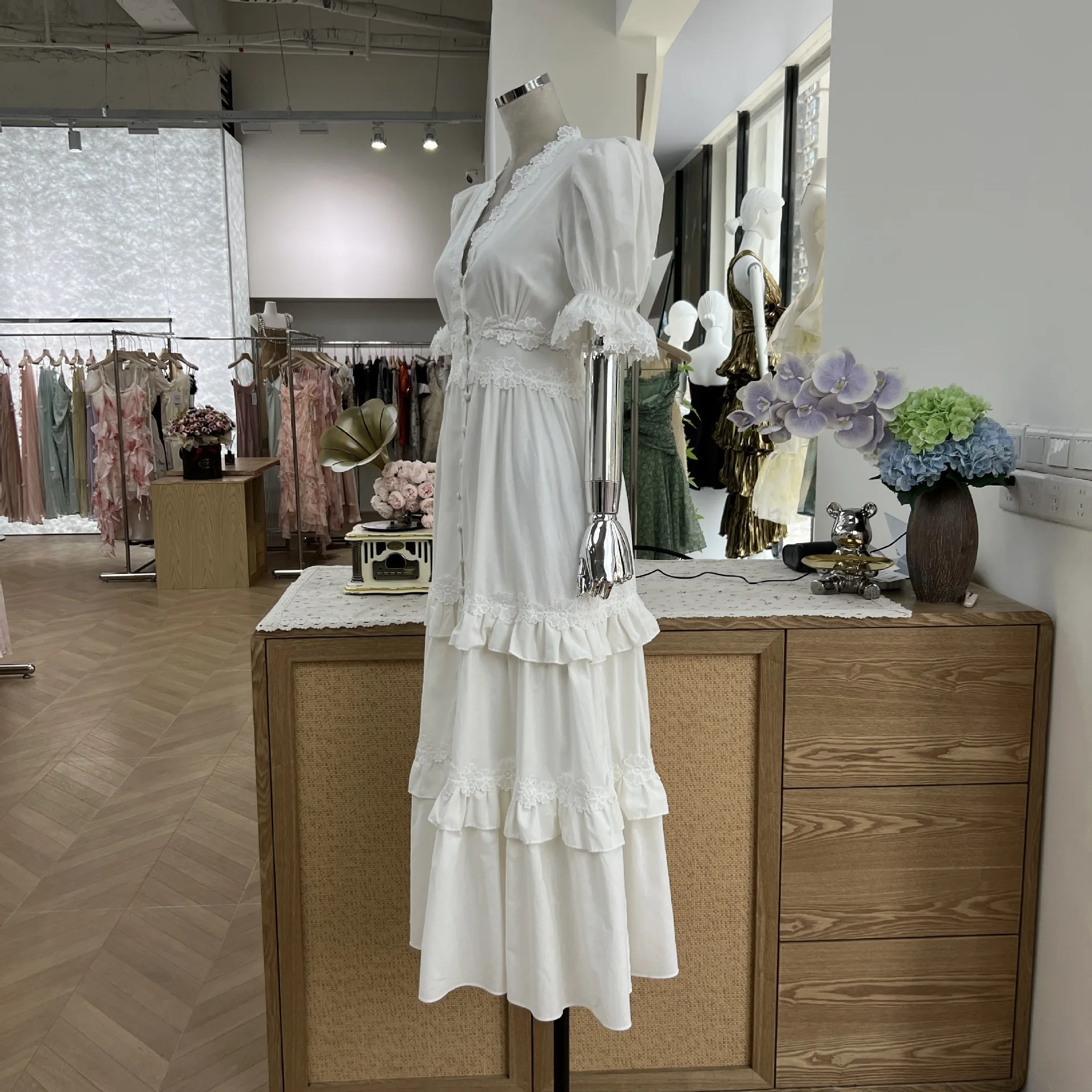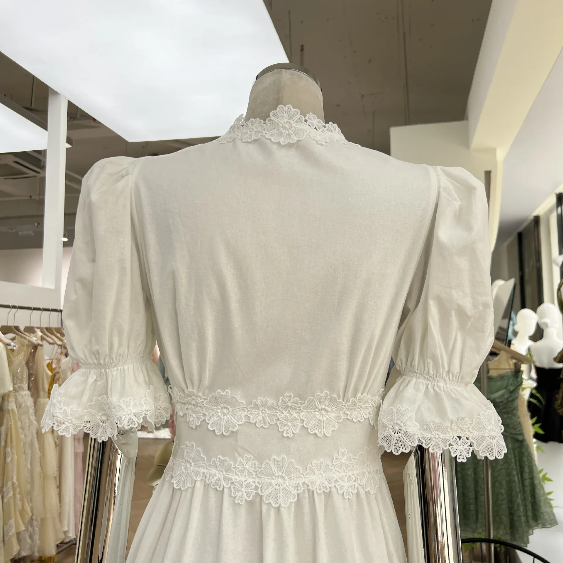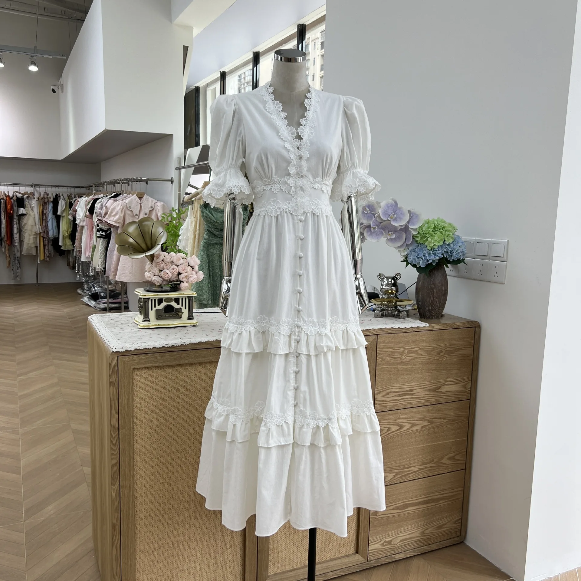 فستان فقاعة الموضة قصيرة الأكمام تصميم 2025 صيف جديد المرأة الدانتيل الرقبة الخصر مشبك عطلة نمط فستان