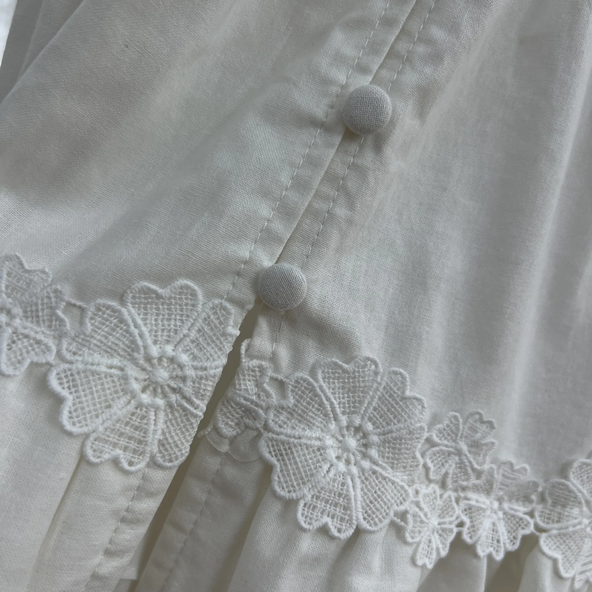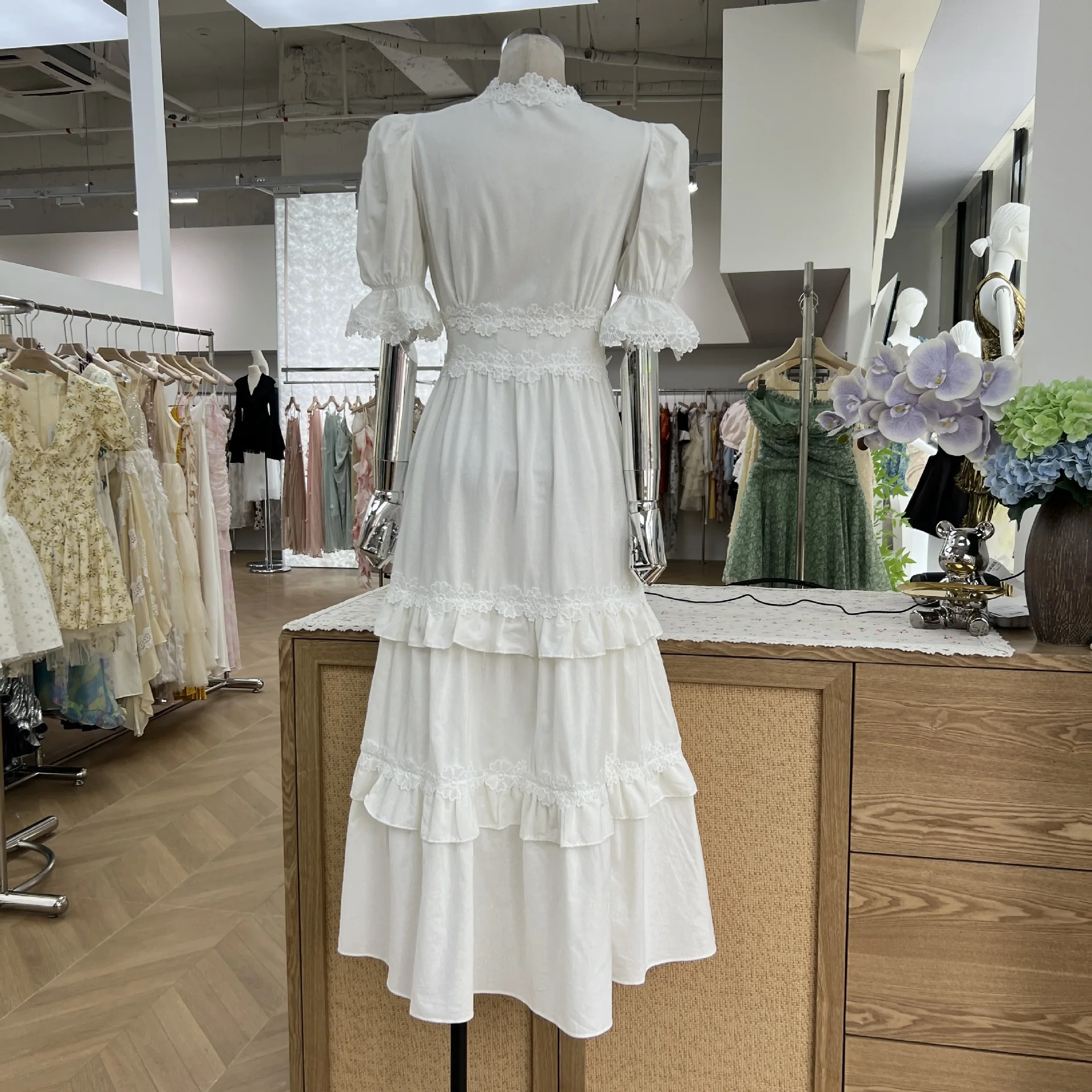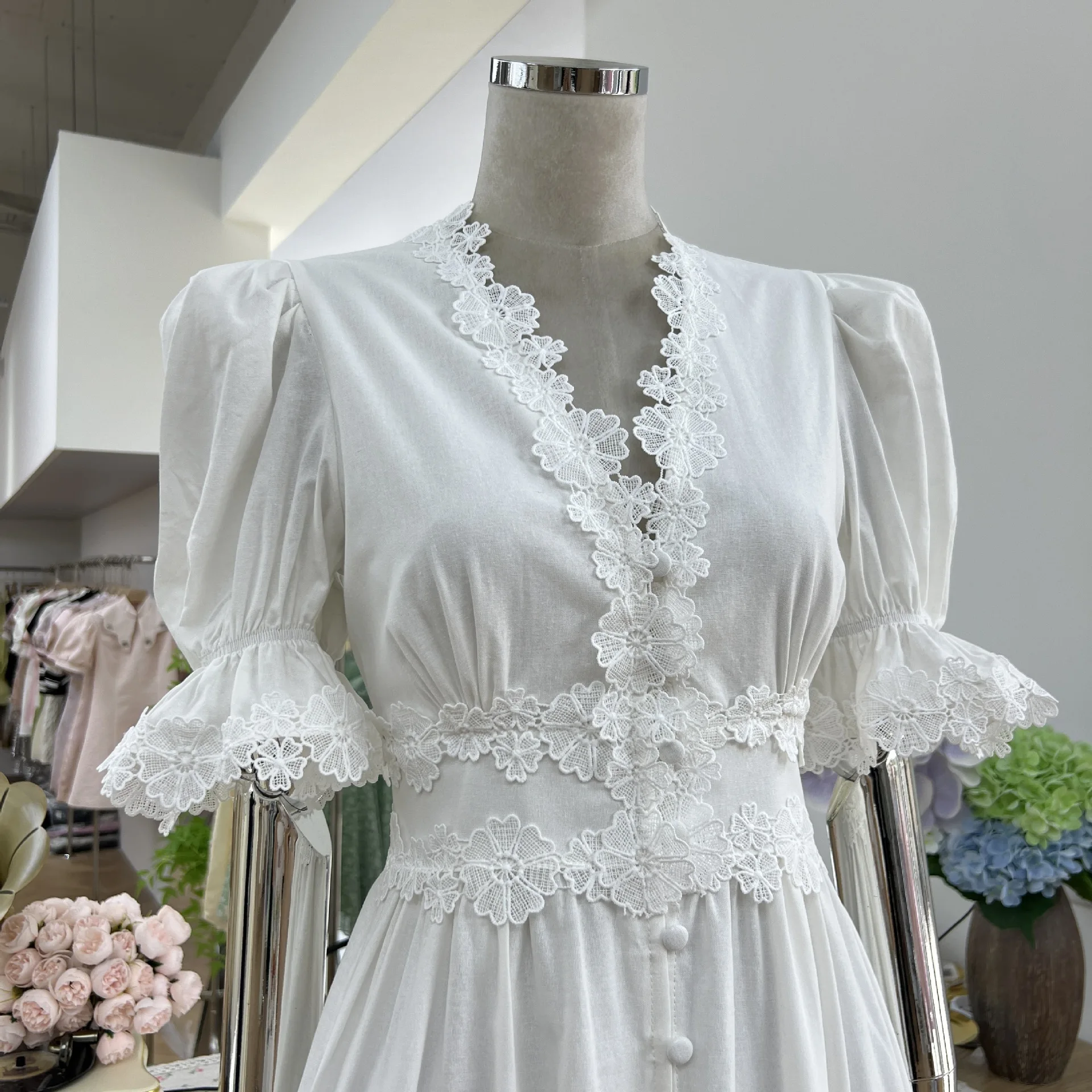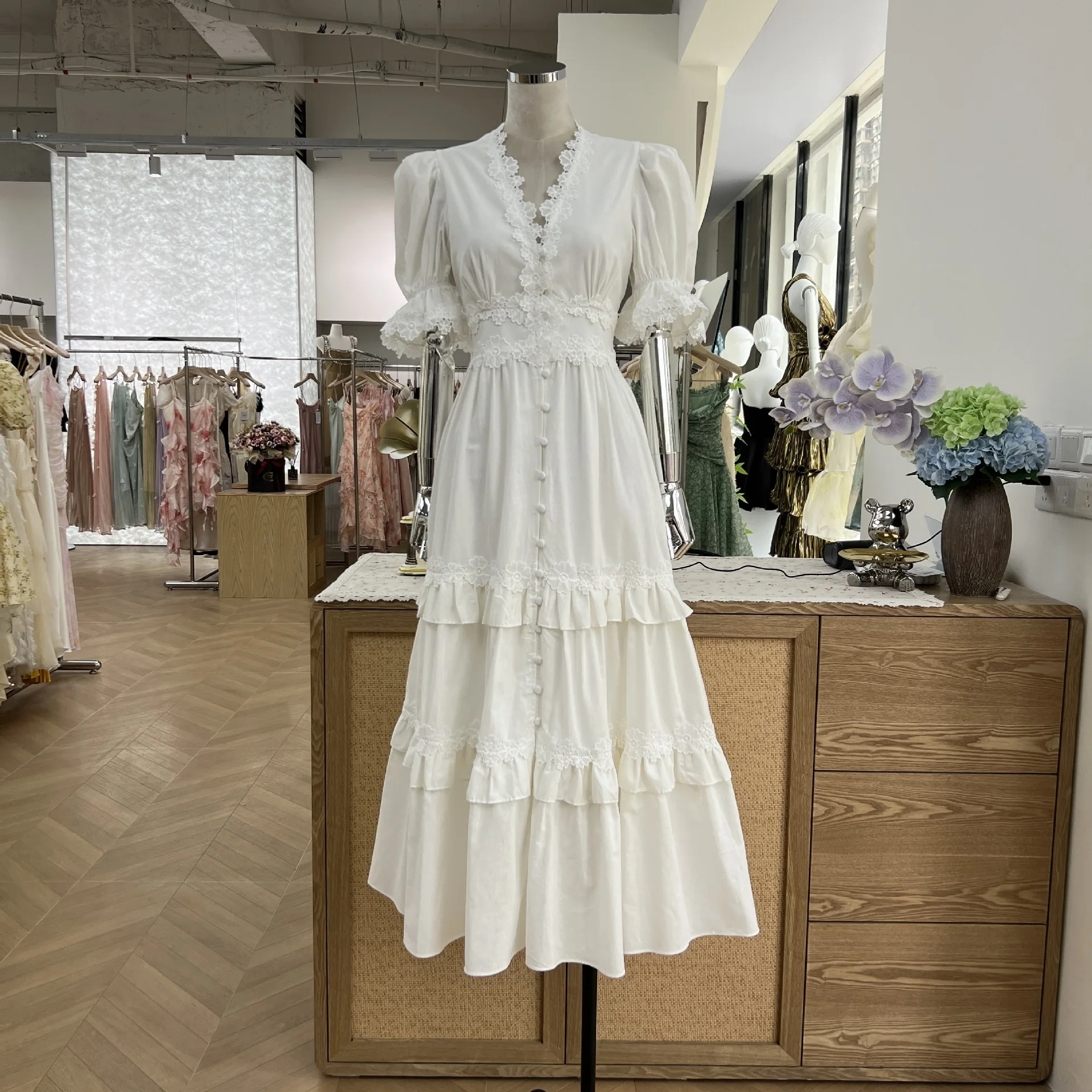 فستان فقاعة الموضة قصيرة الأكمام تصميم 2025 صيف جديد المرأة الدانتيل الرقبة الخصر مشبك عطلة نمط فستان