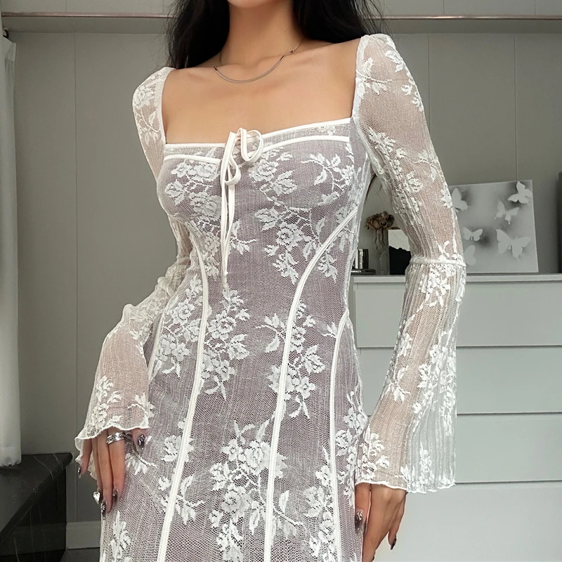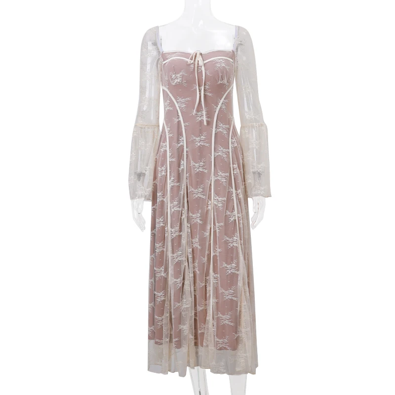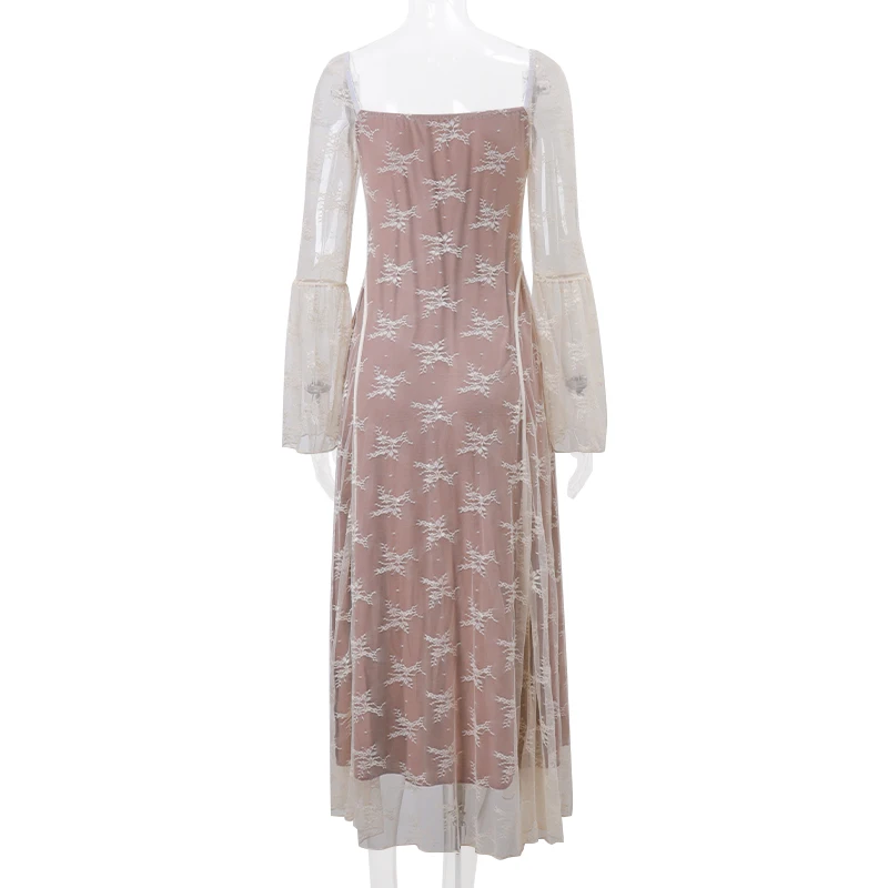 فستان ماكسي بياقة مربعة وأكمام مضيئة ، فرنسي ، لطيف ، مزين بالدانتيل ، أنيق ، جميل ، للحفلات المسائية ، 3