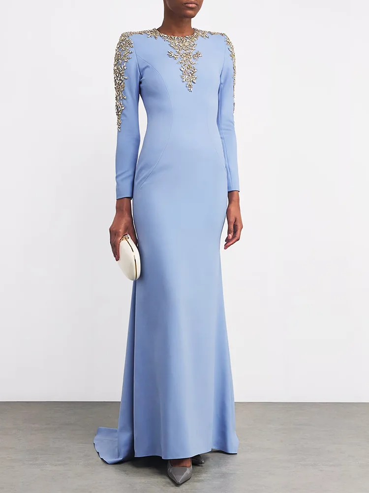 فستان ماكسي نسائي بكتف وألماس مطرز بالخرز