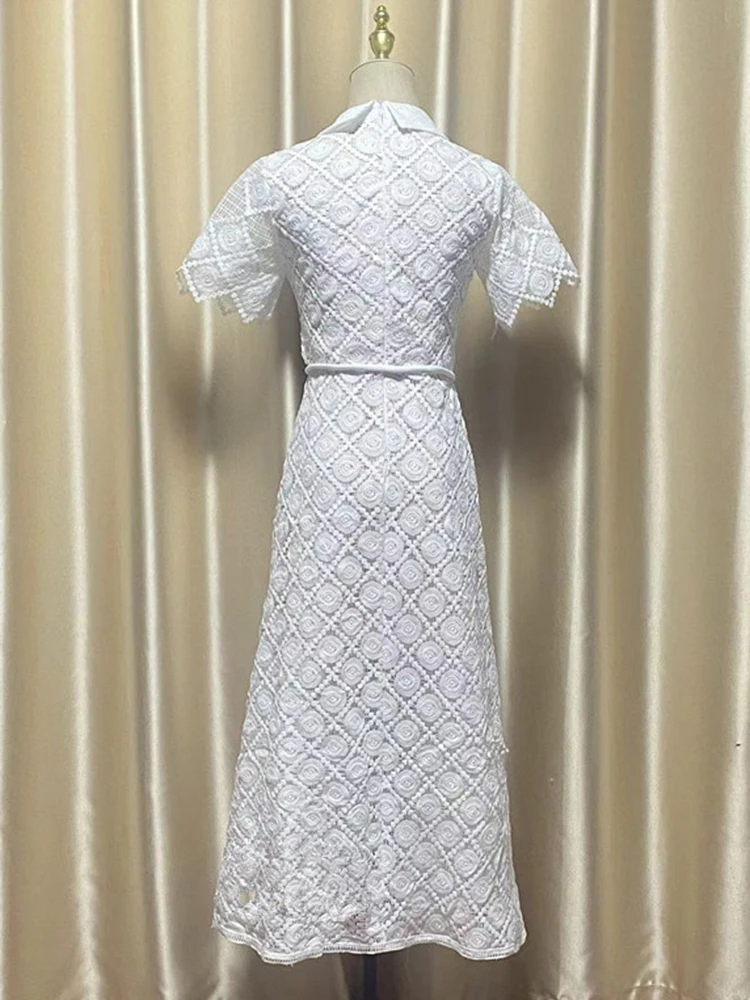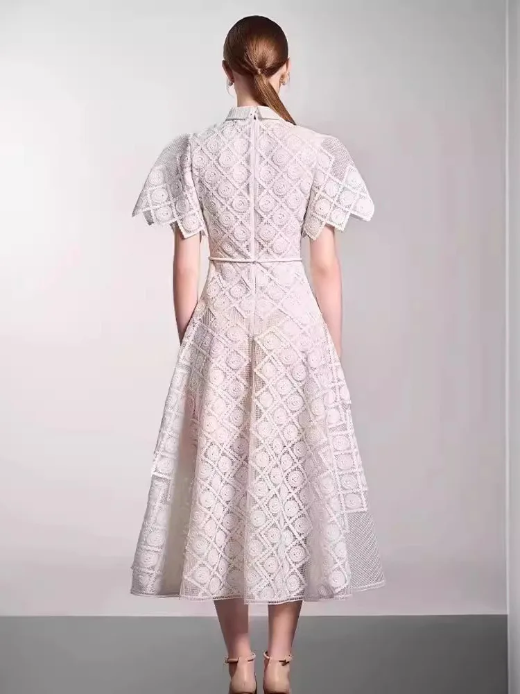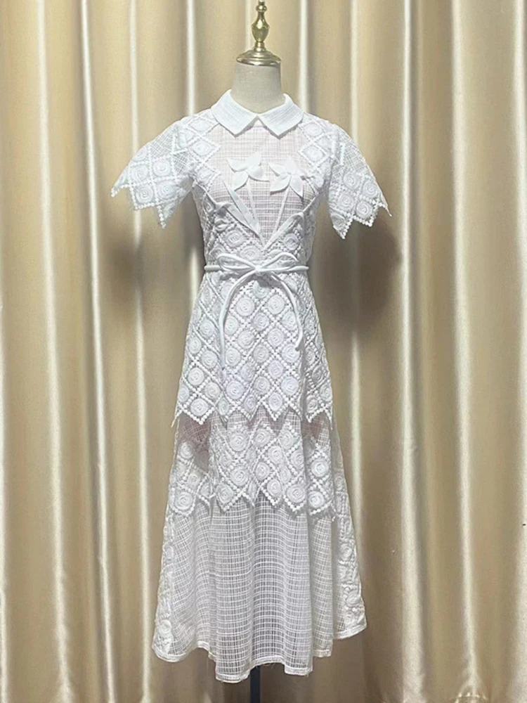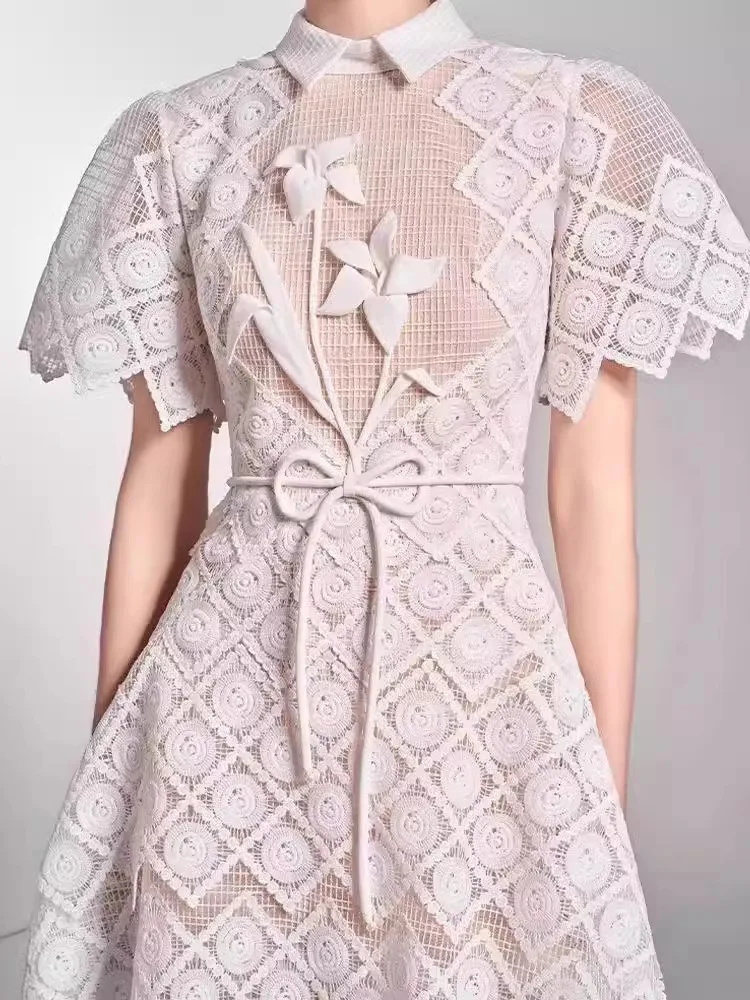 فستان نسائي طويل أنيق بتطريز فرنسي ، مجوف ، زهرة مقطوعة ثلاثية الأبعاد ، دانتيل ، طية صدر السترة ، أكمام قصيرة ، خصر مرتفع