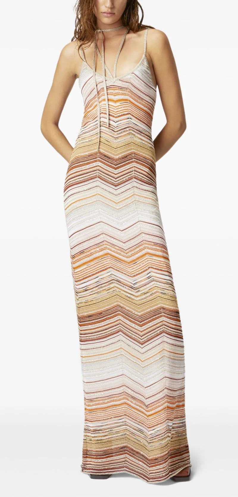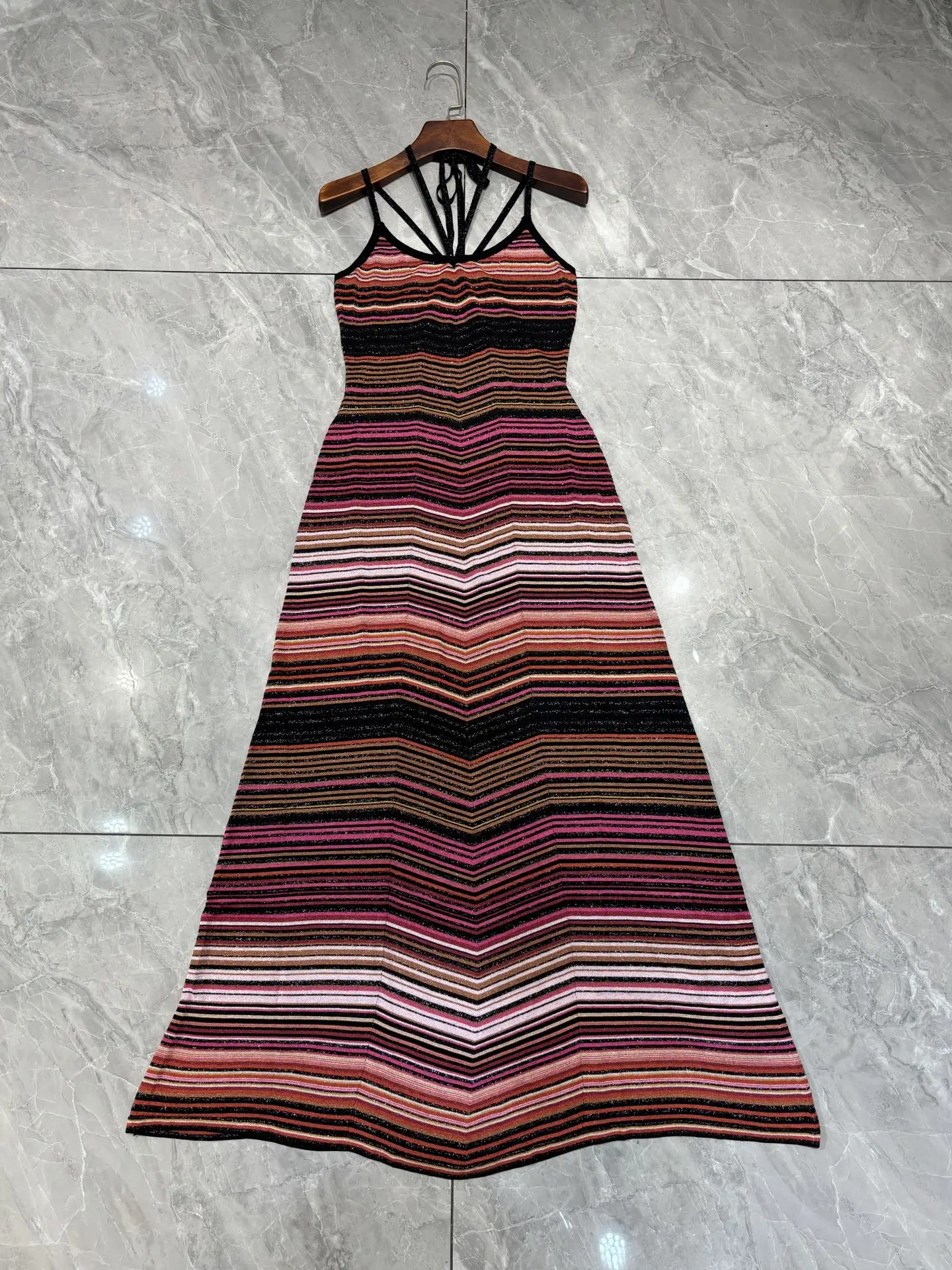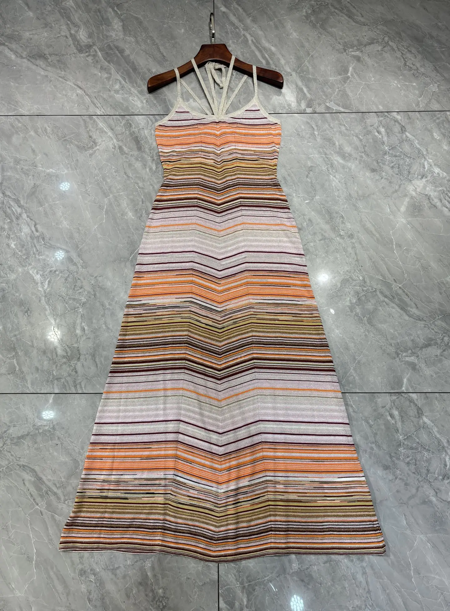 فستان نسائي طويل محبوك برقبة رسن بدون أكمام ومطرز معدني وحزام رفيع