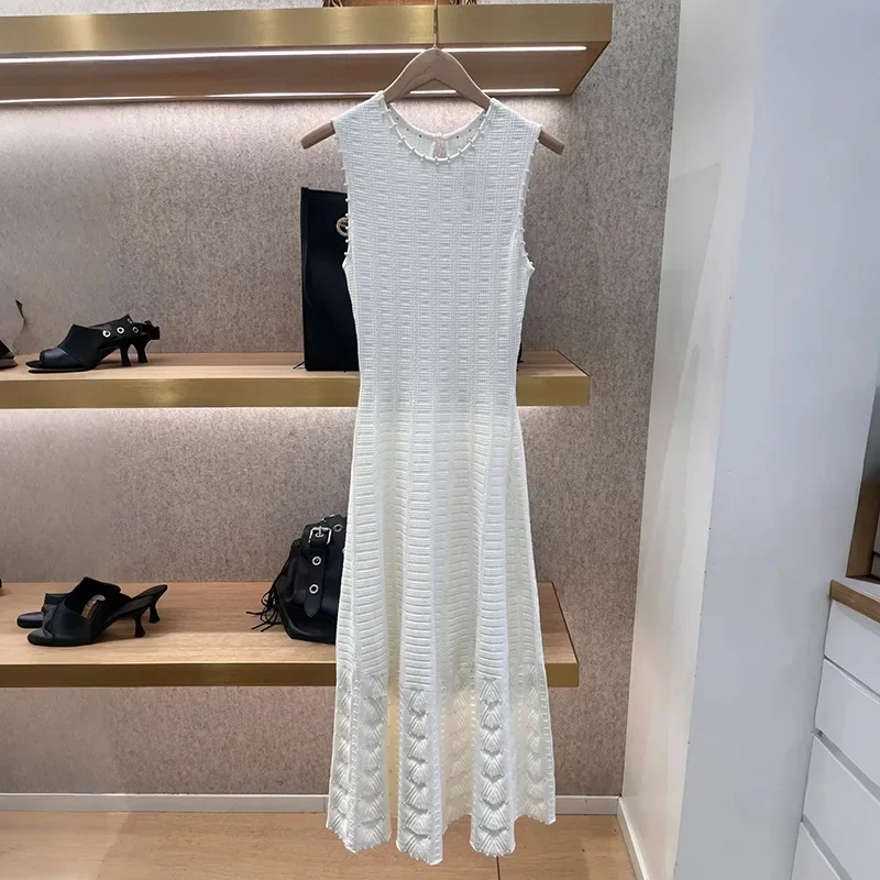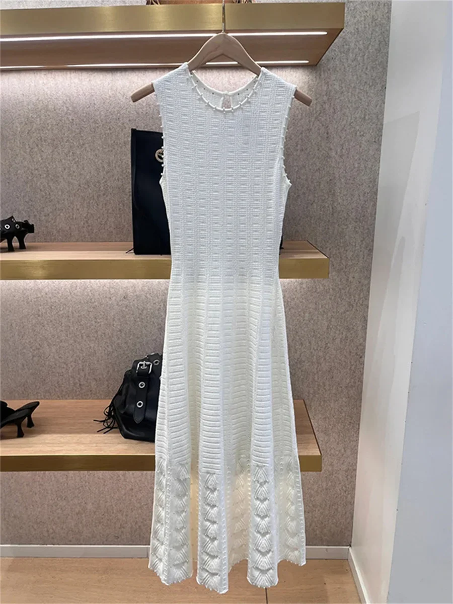 فستان نسائي عالي الخصر نحيف بلون متوسط الطول مزين باللؤلؤ ورقبة دائرية بدون أكمام للنساء على شكل حرف a محبوك رداء صيف 2025