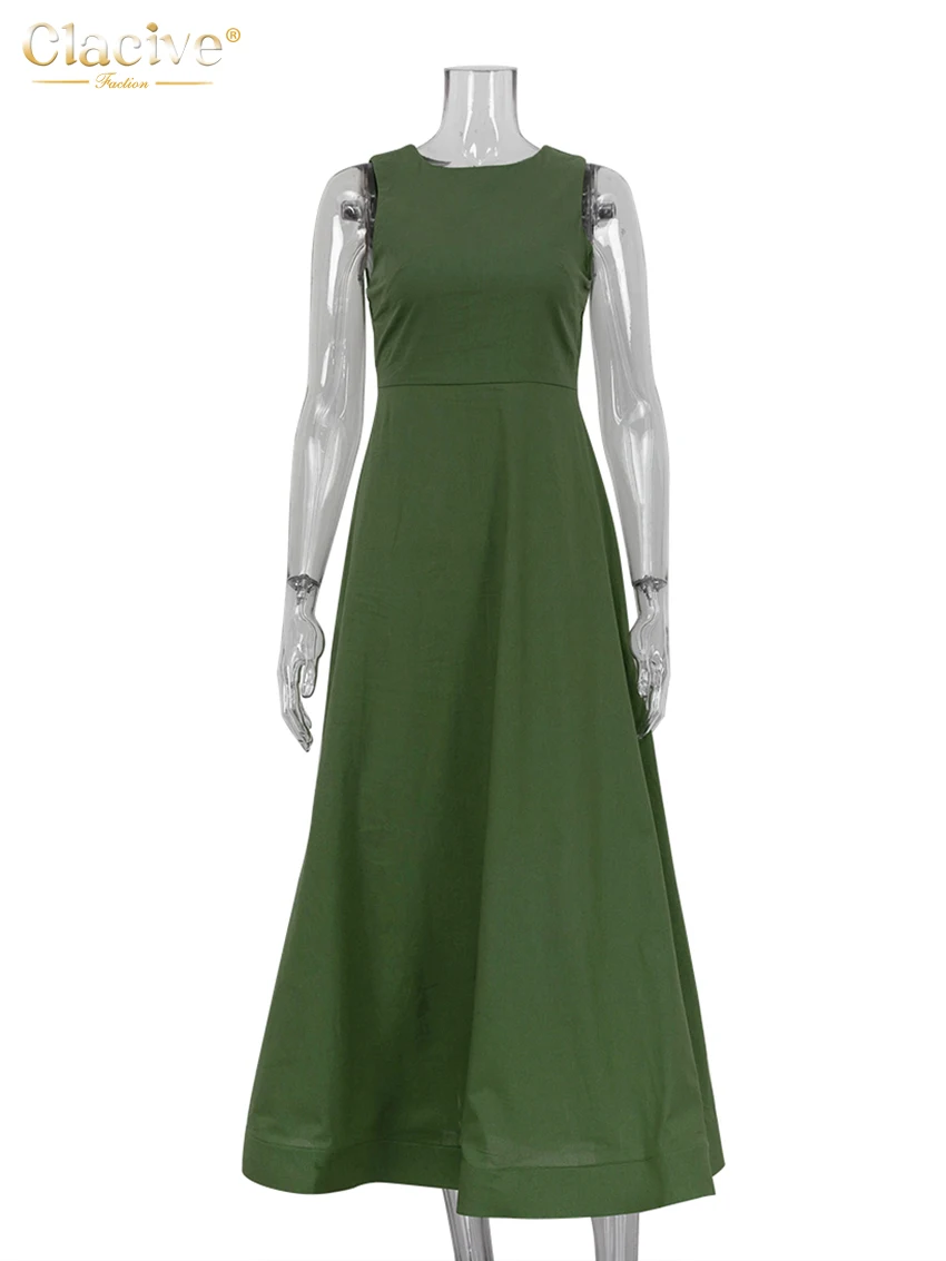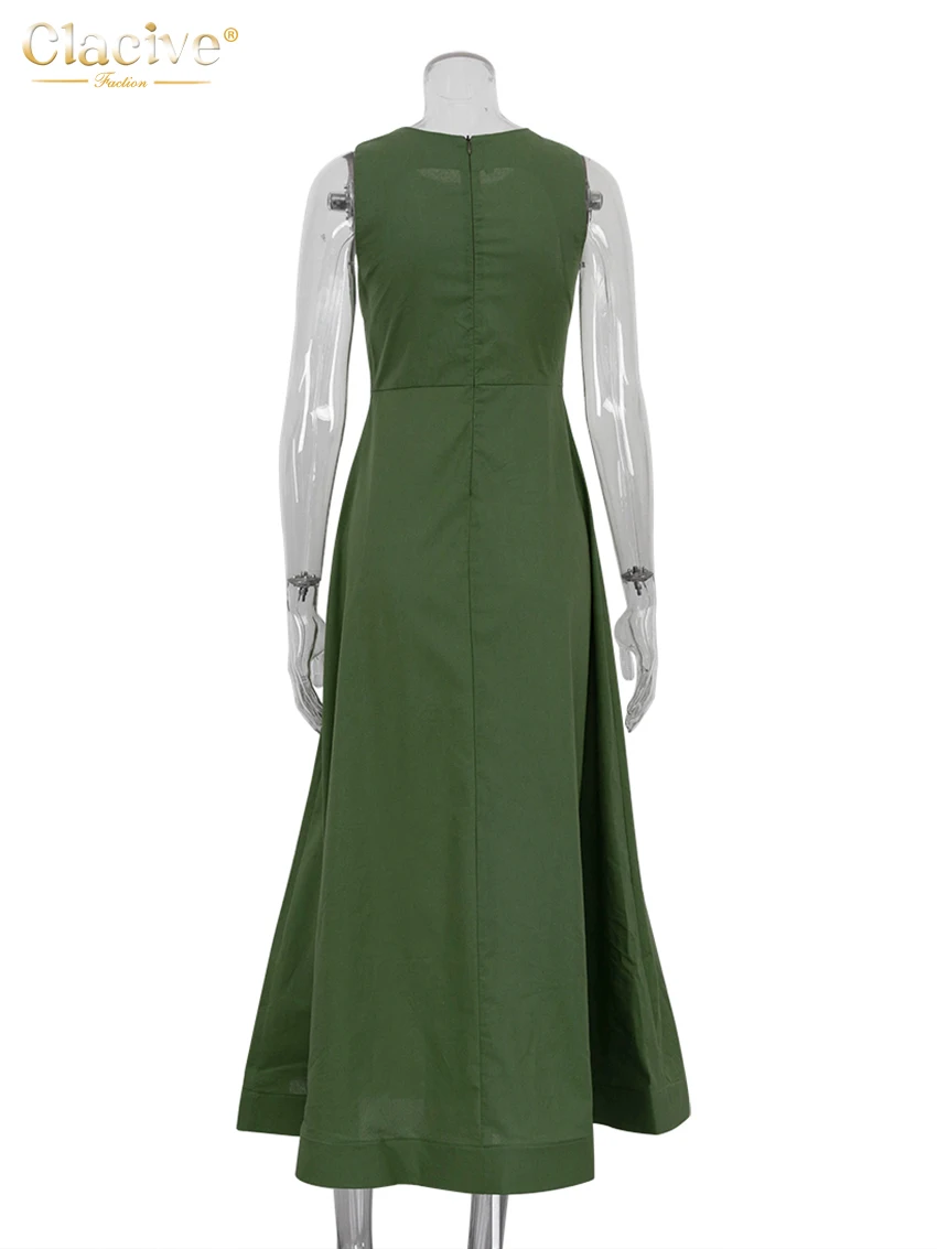-فستان نسائي غير رسمي من القطن الأخضر ، برقبة دائرية ، بلا أكمام ، طول الكاحل ، أنيق ، كلاسيكي ، خصر مرتفع ، أنثى ، صيف