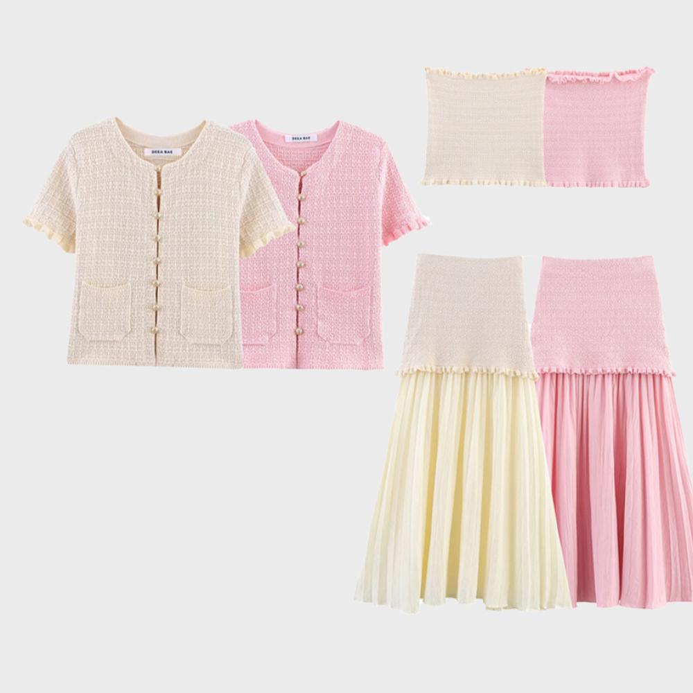ملابس نسائية صيفية جديدة أوروبية وأمريكية ذات طبقات مزخرفة برقبة دائرية وأكمام قصيرة طقم مكون من ثلاث قطع