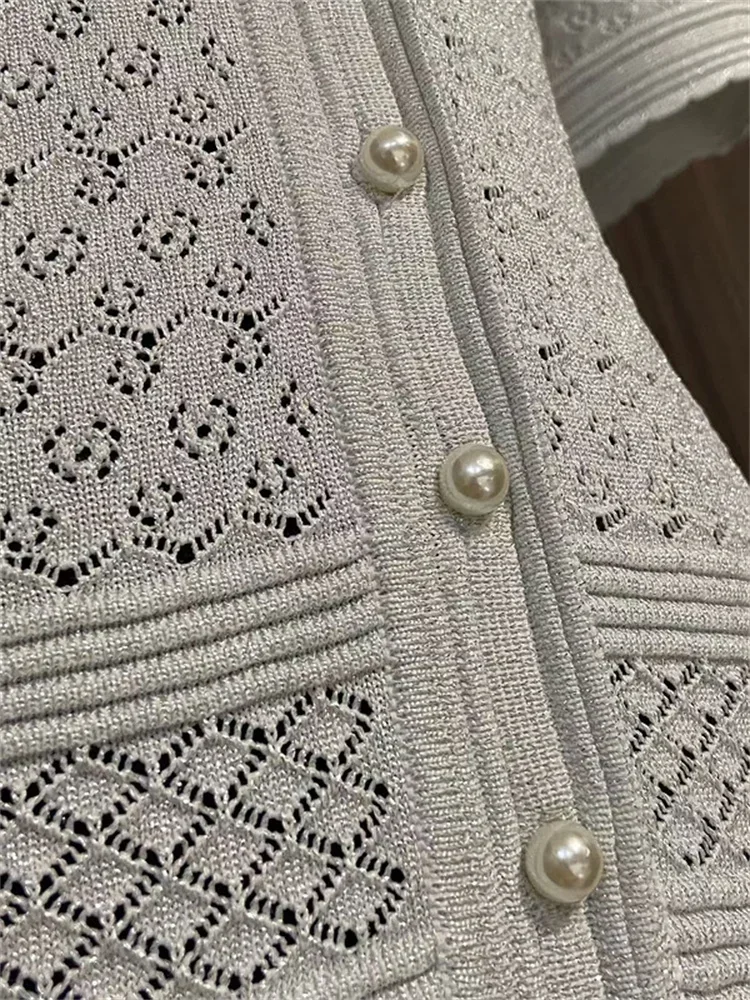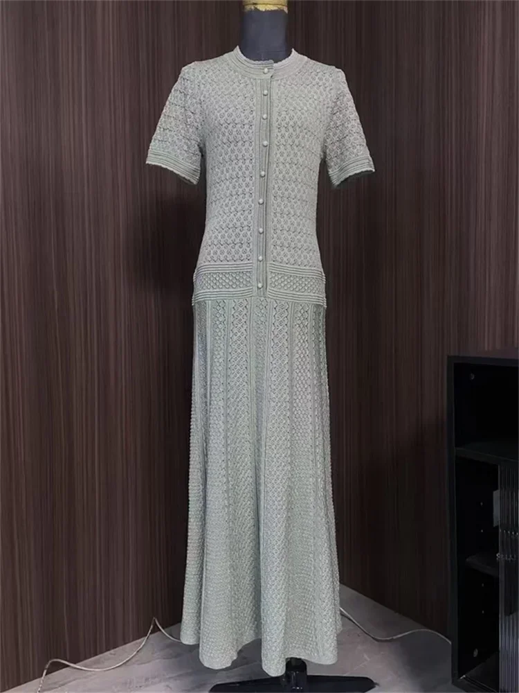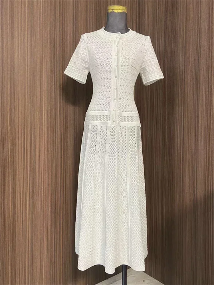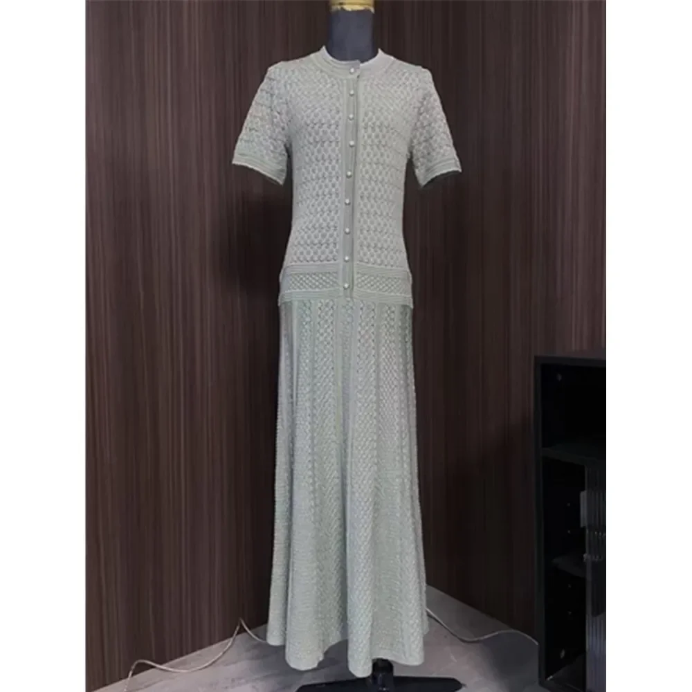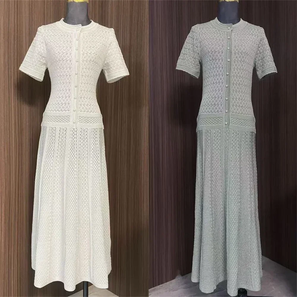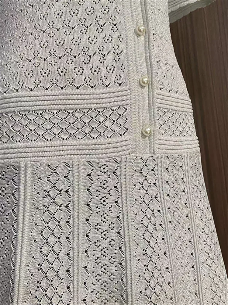 2 ألوان الجوف خارج المرأة متماسكة فستان ميدي أزرار اللؤلؤ أنيقة قصيرة الأكمام 2025 الصيف سيدة واحدة الصدر رداء