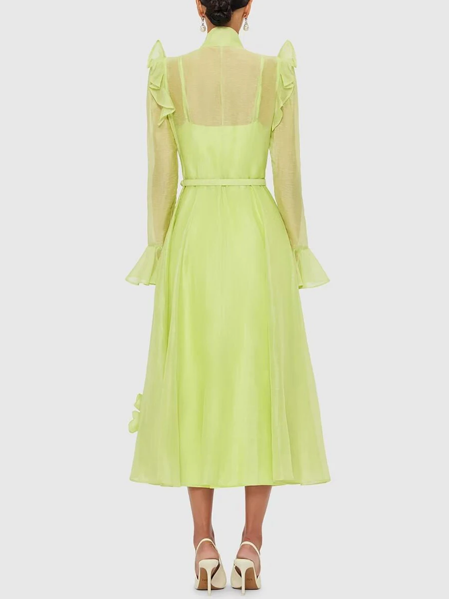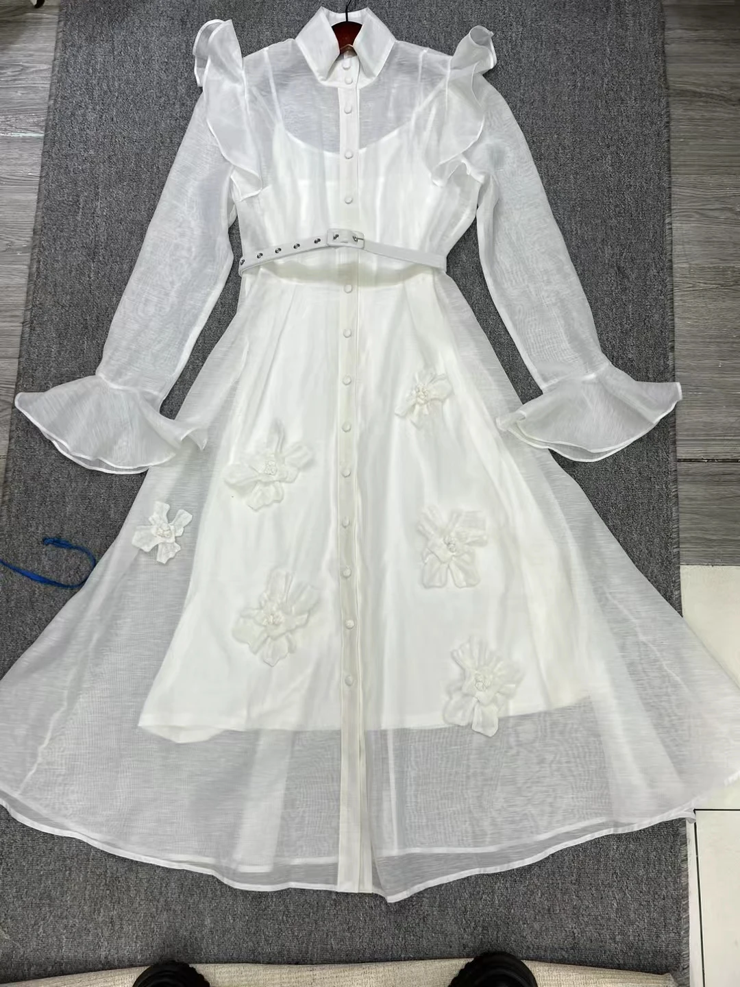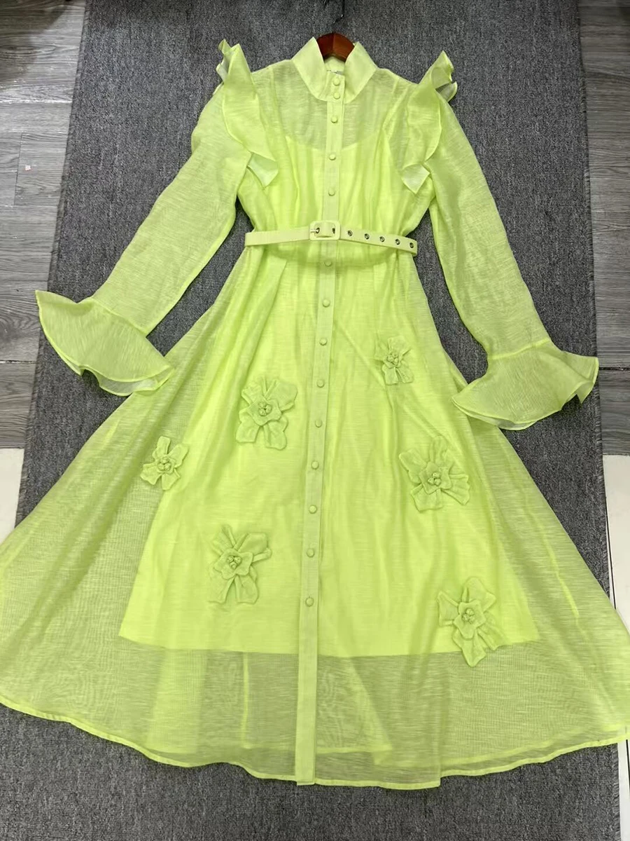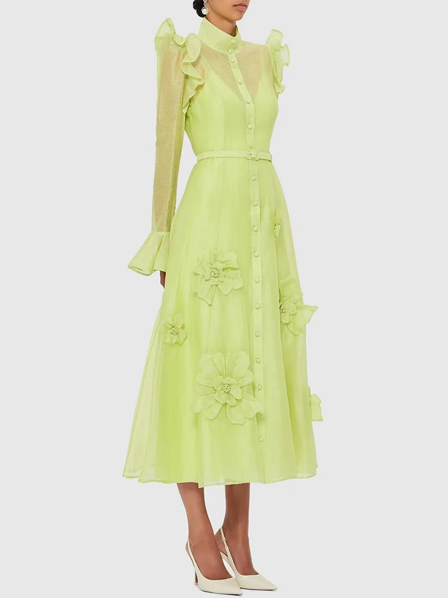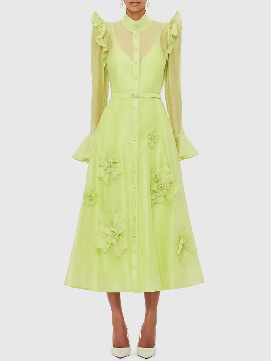 3D Flowers Midi Dresses for Women Stand Collar Flare Sleeve High Waist Spliced Sashes Dress Female New