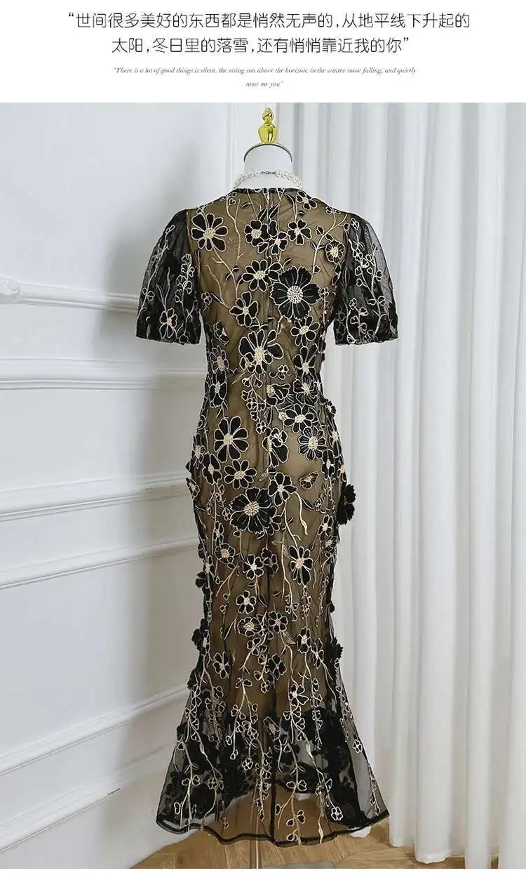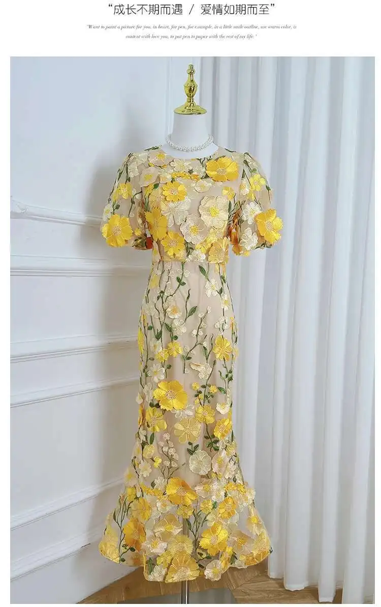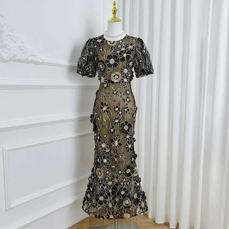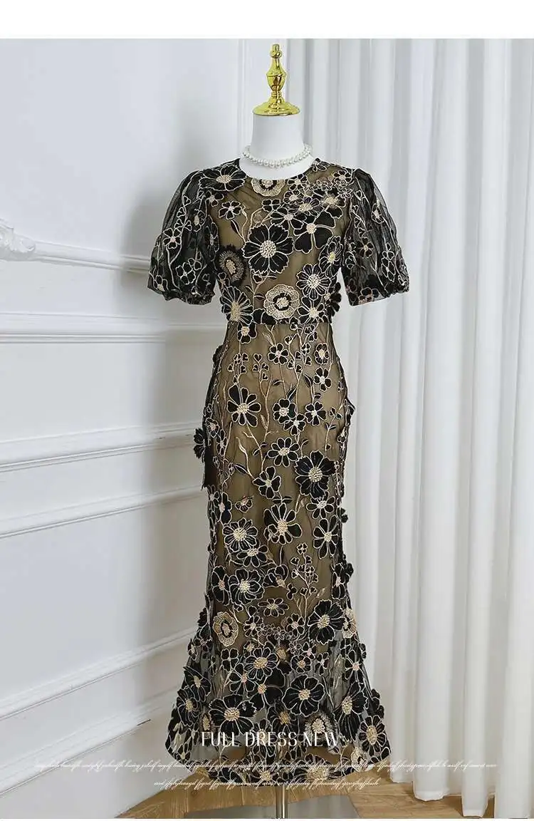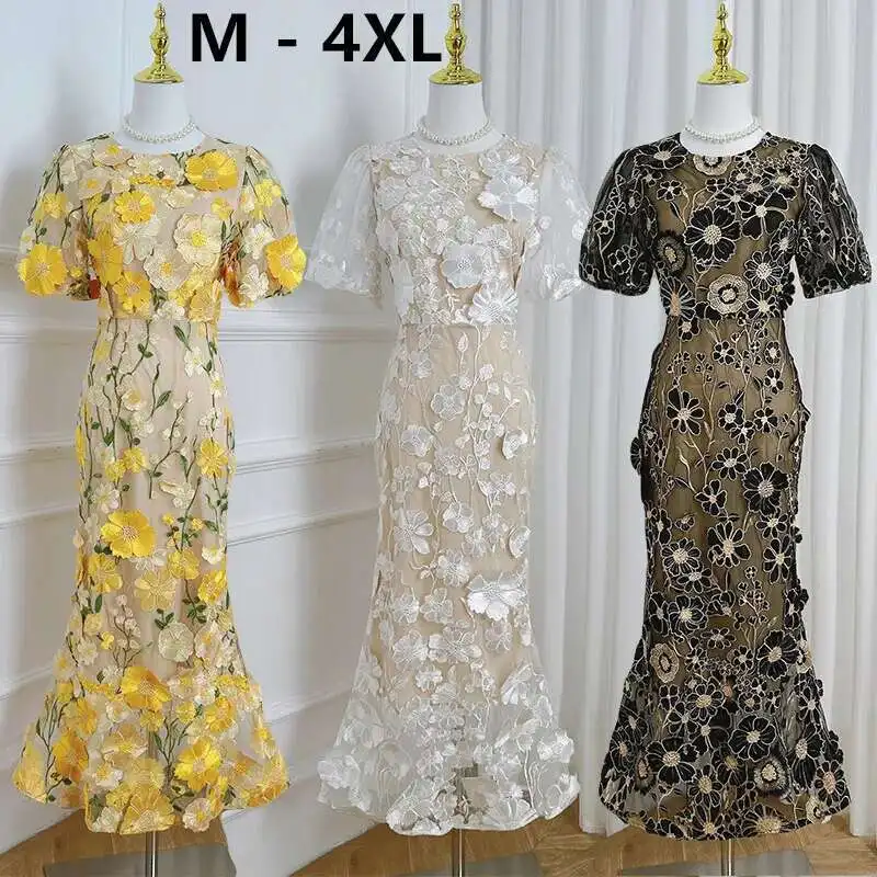 3XL 4XL أنيقة ثلاثية الأبعاد زهرة طويلة فساتين السهرة الدانتيل النساء الصيف فقاعة قصيرة الأكمام التطريز ذيل السمكة حورية البحر