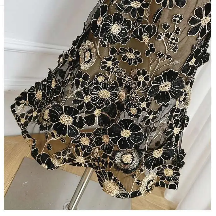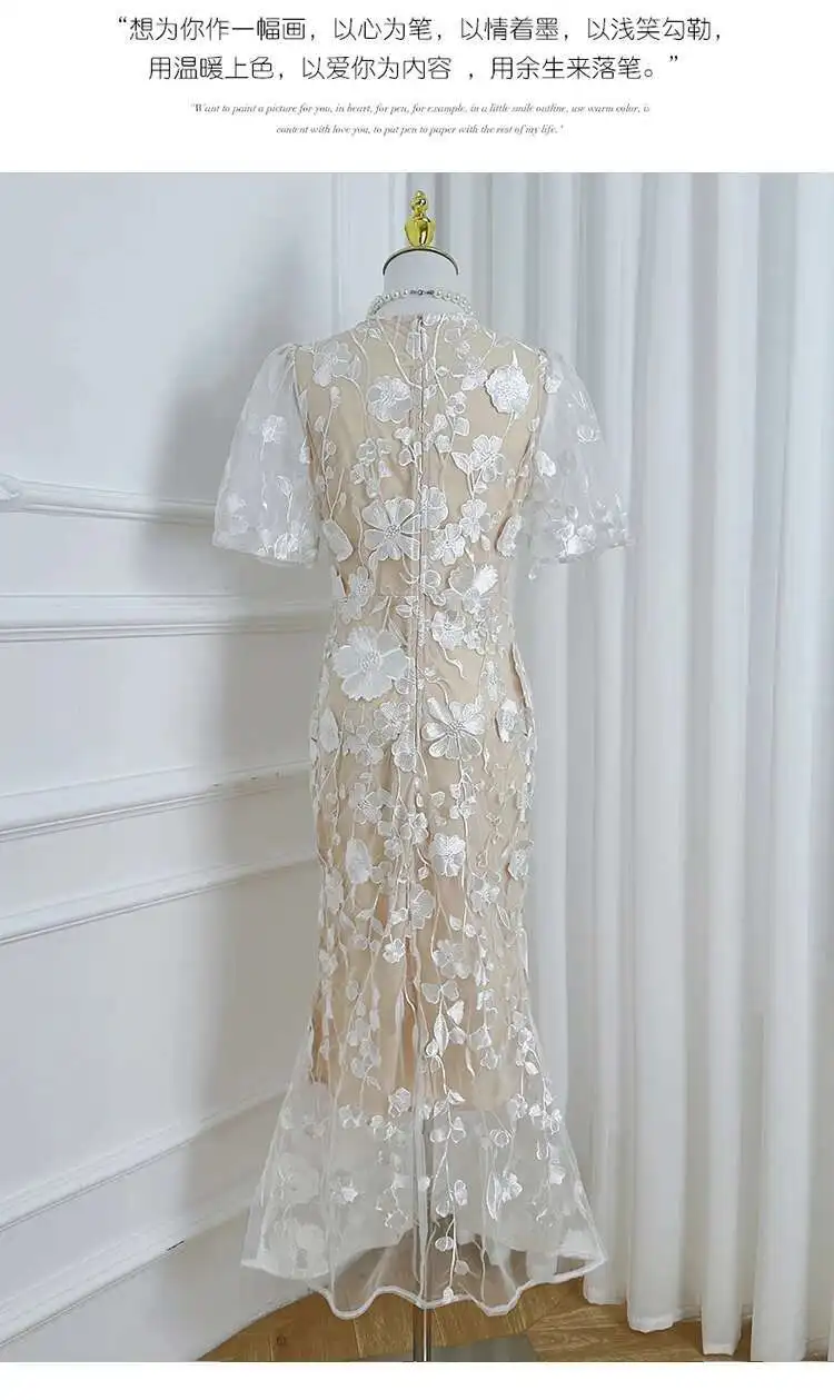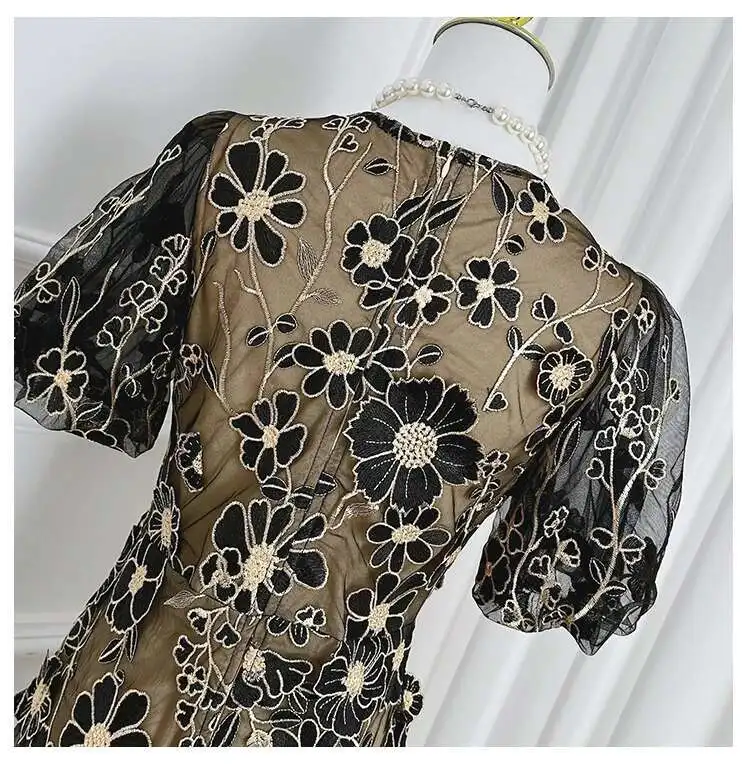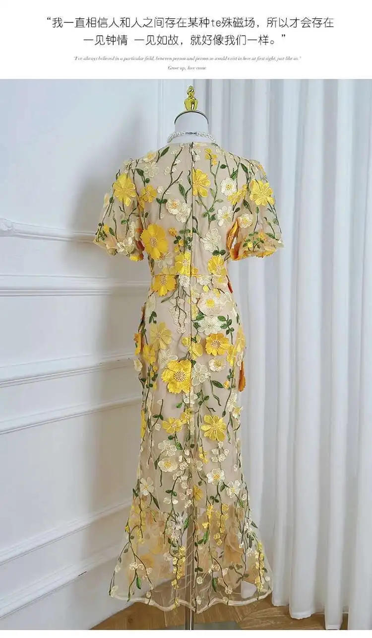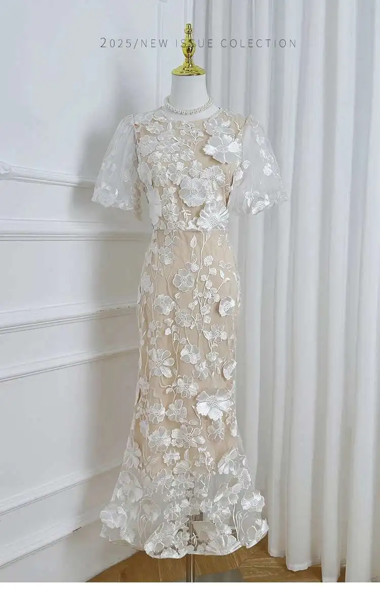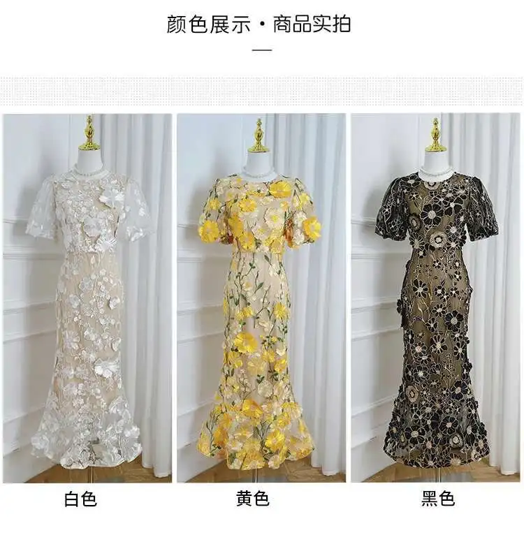 3XL 4XL أنيقة ثلاثية الأبعاد زهرة طويلة فساتين السهرة الدانتيل النساء الصيف فقاعة قصيرة الأكمام التطريز ذيل السمكة حورية البحر